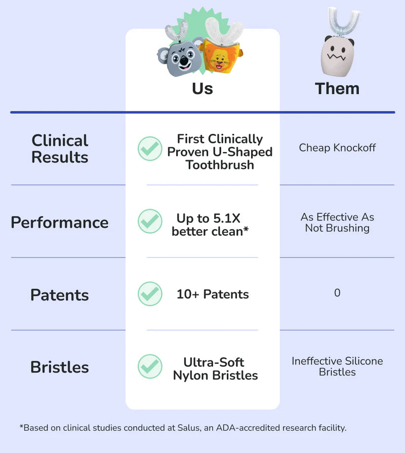 autobrush is the world's only ADA-accepted u-shape toothbrush. We have 3 clinical studies (and more to come!). We are the only u-shaped toothbrush on the market shown to brush even better than traditional manual toothbrushes.